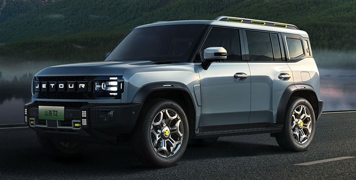 تصميم السيارة Jetour T2 مربعى الشكل بزوايا وخطوط حادة، مع عجلات رياضية ومصابيح أمامية LED وشبكة كبيرة عليها شعار جيتور. من ناحية الأبعاد، فالطول 478.5 سم والعرض 200.6 سم والإرتفاع 187.5 سم او 191.0 سم، وقاعدة العجلات 280.0 سم.